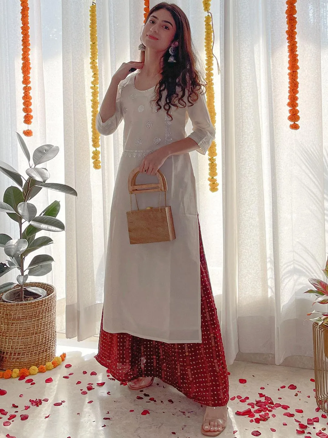 White Kurti & Red Pyjama set for Women